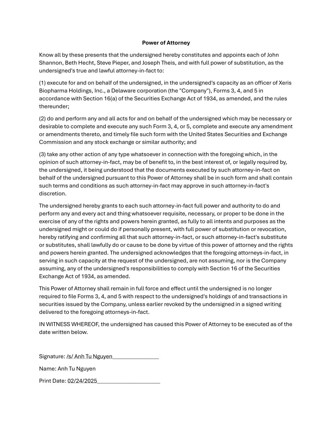 Power of Attorney Know all by these presents that the undersigned hereby constitutes and appoints each of John Shannon, Beth Hecht, Steve Pieper, and Joseph Theis, and with full power of substitution, as the undersigned's true and lawful attorney-in-fact to: (1) execute for and on behalf of the undersigned, in the undersigned's capacity as an officer of Xeris Biopharma Holdings, Inc., a Delaware corporation (the "Company"), Forms 3, 4, and 5 in accordance with Section 16(a) of the Securities Exchange Act of 1934, as amended, and the rules thereunder; (2) do and perform any and all acts for and on behalf of the undersigned which may be necessary or desirable to complete and execute any such Form 3, 4, or 5, complete and execute any amendment or amendments thereto, and timely file such form with the United States Securities and Exchange Commission and any stock exchange or similar authority; and (3) take any other action of any type whatsoever in connection with the foregoing which, in the opinion of such attorney-in-fact, may be of benefit to, in the best interest of, or legally required by, the undersigned, it being understood that the documents executed by such attorney-in-fact on behalf of the undersigned pursuant to this Power of Attorney shall be in such form and shall contain such terms and conditions as such attorney-in-fact may approve in such attorney-in-fact's discretion. The undersigned hereby grants to each such attorney-in-fact full power and authority to do and perform any and every act and thing whatsoever requisite, necessary, or proper to be done in the exercise of any of the rights and powers herein granted, as fully to all intents and purposes as the undersigned might or could do if personally present, with full power of substitution or revocation, hereby ratifying and confirming all that such attorney-in-fact, or such attorney-in-fact's substitute or substitutes, shall lawfully do or cause to be done by virtue of this power of attorney and the rights and powers herein granted. The undersigned acknowledges that the foregoing attorneys-in-fact, in serving in such capacity at the request of the undersigned, are not assuming, nor is the Company assuming, any of the undersigned's responsibilities to comply with Section 16 of the Securities Exchange Act of 1934, as amended. This Power of Attorney shall remain in full force and effect until the undersigned is no longer required to file Forms 3, 4, and 5 with respect to the undersigned's holdings of and transactions in securities issued by the Company, unless earlier revoked by the undersigned in a signed writing delivered to the foregoing attorneys-in-fact. IN WITNESS WHEREOF, the undersigned has caused this Power of Attorney to be executed as of the date written below. Signature: /s/ Anh Tu Nguyen_________________ Name: Anh Tu Nguyen Print Date: 02/24/2025_______________________